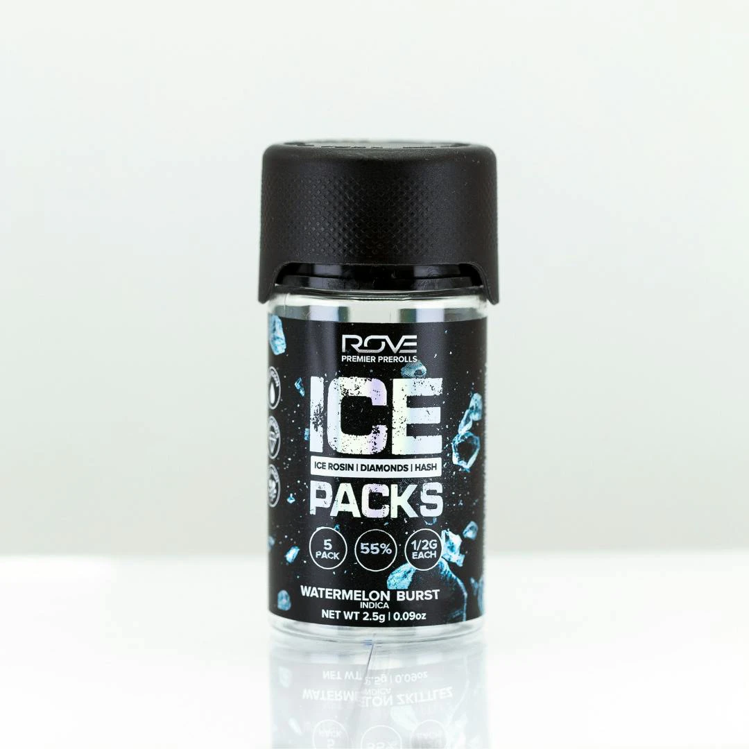 Rove Ice Packs, the world’s first triple-infused preroll. Made with premium-grade flower fully-infused with THCA diamonds and solventless ice hash rosin, they're expertly rolled, then coated with more ice hash. Ready for a tasty treat? Watermelon Burst is here to deliver! Our strain offers a juicy mix of sweet melon, head-rushing euphoria and a unique smoking experience. Get ready for the perfect balance of relaxation and energy with our Watermelon Burst.