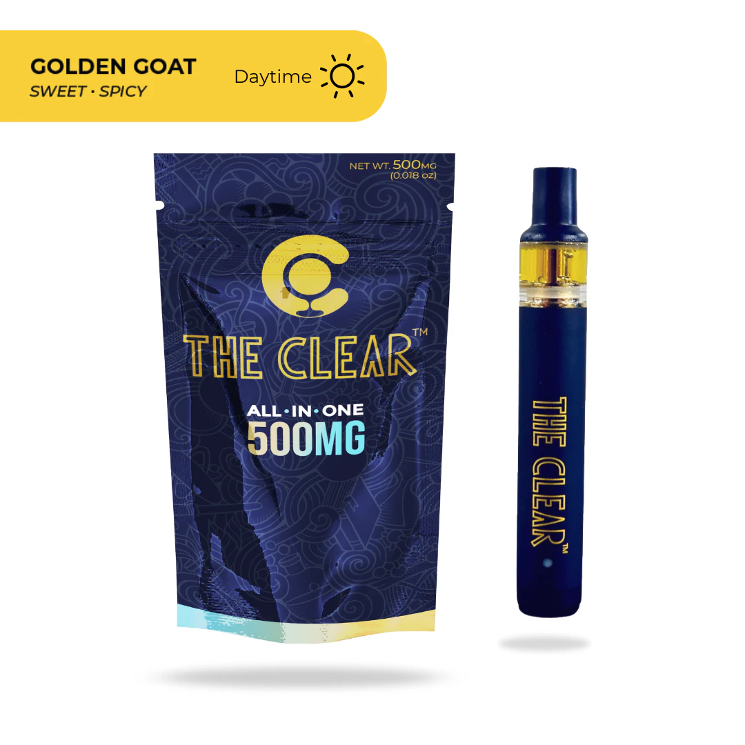 The All-in-one vape is a discreet, pocket-sized version of The Clear Elite cartridge that comes fully equipped for easy consumption. This vape contains 500mg of our ultra-premium distillate with all-natural plant derived terpenes. Golden Goat emulates the popular cannabis strain. Known for sativa-dominance, along with mild sweet, spicy, and sour notes, Golden Goat is a full-bodied, tropical experience.   The Clear Elite AIO vape pen comes with a pre-charged, rechargeable battery and Cilicon hardware with food-grade glass tanks, stainless steel posts, and new ceramic heating technology for a rich and pure taste. More on-the-go cannabis consumers can try out the ultra-premium, ultra-refined vaping experience that goes hand in hand with The Clear Elite.